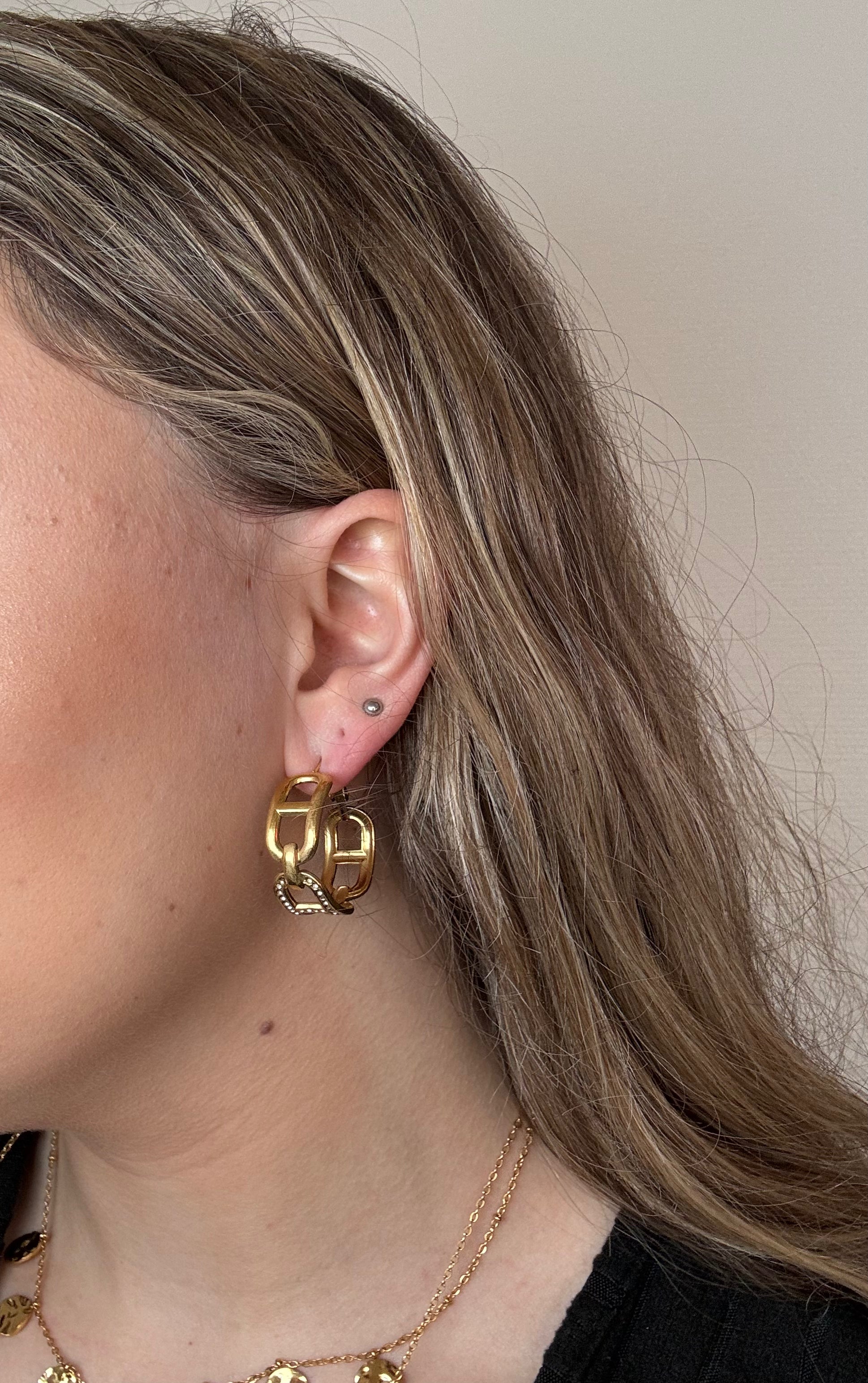 Boucles d’oreilles créoles en acier inoxydable, En maille marine avec des strass.